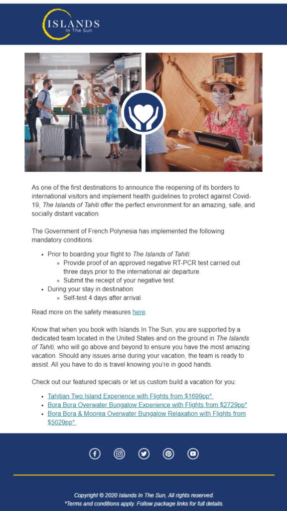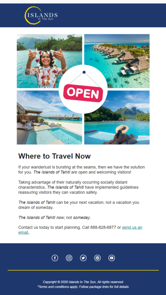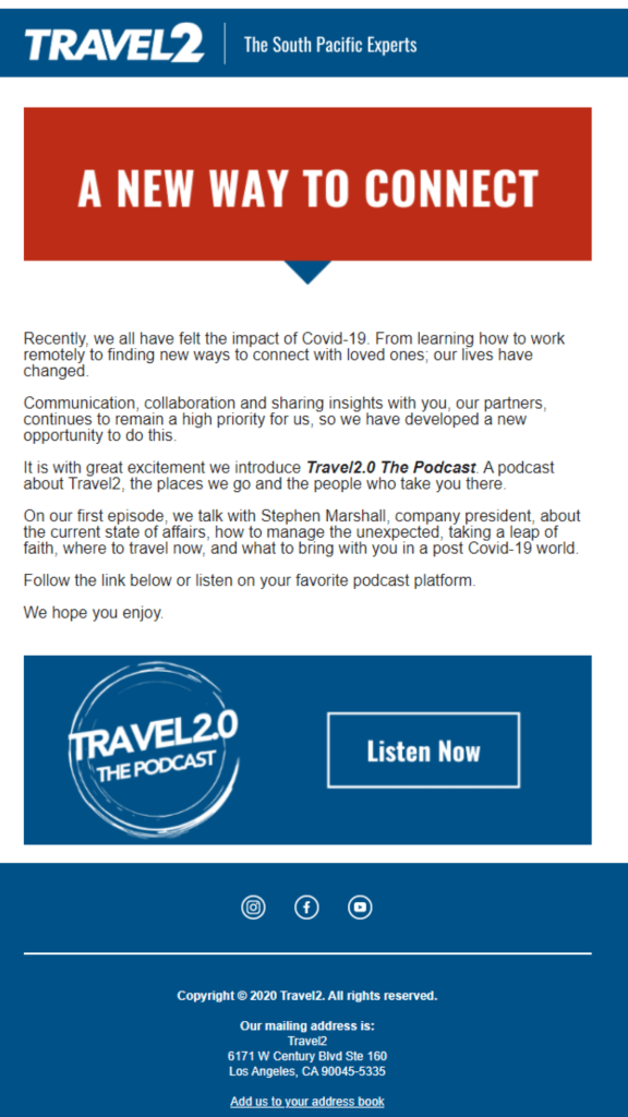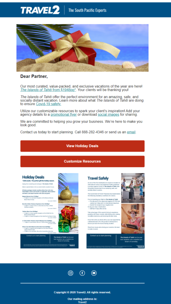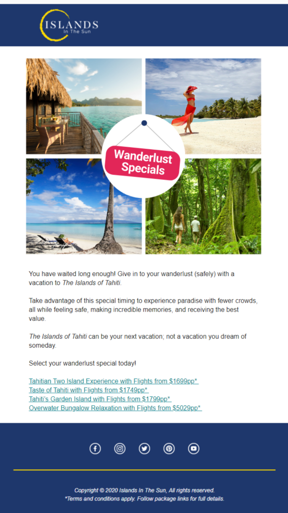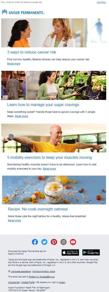 Throughout my career I have built, executed, and measured email strategies for multiple brands. I have worked cross-functionally to determine audience segmentation, drop schedules, content A/B testing, and automated drip campaigns. I custom built brand compliant and mobile responsive email templates. I designed lead generation campaigns adding to email databases reaching over 20,000 customers. I have experience working in and troubleshooting email platforms including Salesforce Marketing Cloud, Oracle Eloqua, and Mailchimp. Below are a few examples of emails I designed and/or authored.